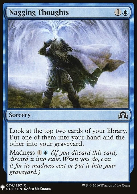 Look at the top two cards of your library. Put one of them into your hand and the other into your graveyard. Madness {1}{U} (If you discard this card, discard it into exile. When you do, cast it for its madness cost or put it into your graveyard.)