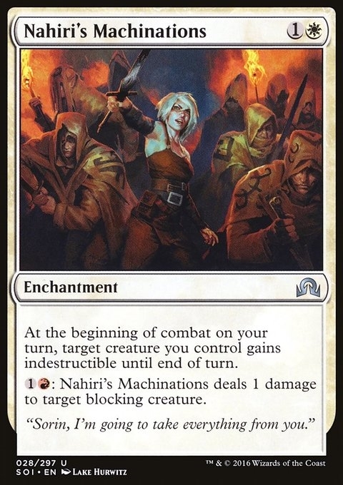 At the beginning of combat on your turn, target creature you control gains indestructible until end of turn. {1}{R}: Nahiri's Machinations deals 1 damage to target blocking creature.