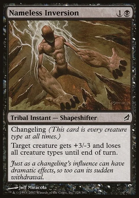 Changeling (This card is every creature type.) Target creature gets +3/-3 and loses all creature types until end of turn.