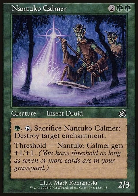 {G}, {T}, Sacrifice Nantuko Calmer: Destroy target enchantment. Threshold — Nantuko Calmer gets +1/+1 as long as seven or more cards are in your graveyard.