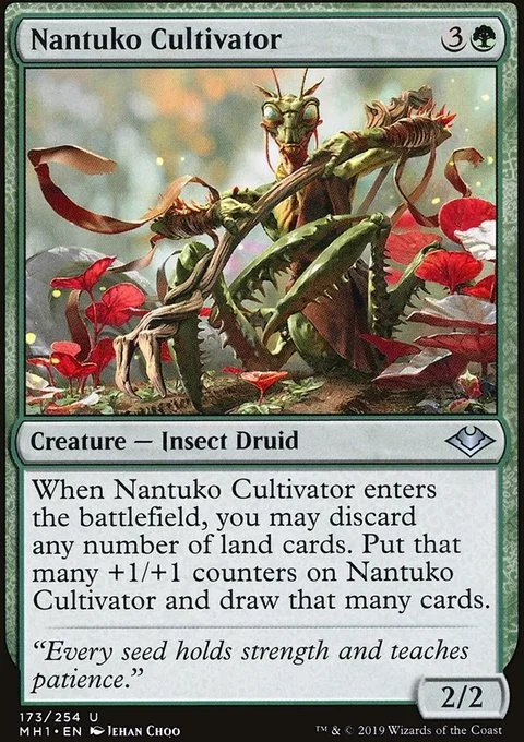 When Nantuko Cultivator enters the battlefield, you may discard any number of land cards. Put that many +1/+1 counters on Nantuko Cultivator and draw that many cards.
