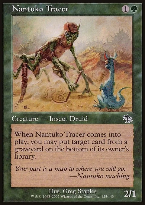 When Nantuko Tracer enters, you may put target card from a graveyard on the bottom of its owner's library.