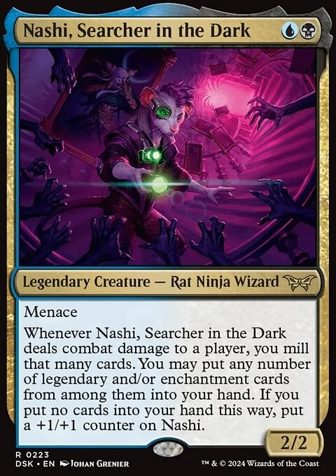 Menace Whenever Nashi, Searcher in the Dark deals combat damage to a player, you mill that many cards. You may put any number of legendary and/or enchantment cards from among them into your hand. If you put no cards into your hand this way, put a +1/+1 counter on Nashi.