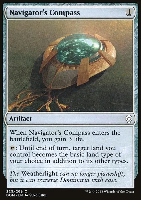When Navigator's Compass enters the battlefield, you gain 3 life. {T}: Until end of turn, target land you control becomes the basic land type of your choice in addition to its other types.