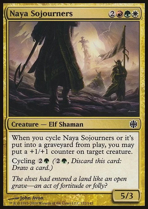 When you cycle Naya Sojourners or it dies, you may put a +1/+1 counter on target creature. Cycling {2}{G} ({2}{G}, Discard this card: Draw a card.)