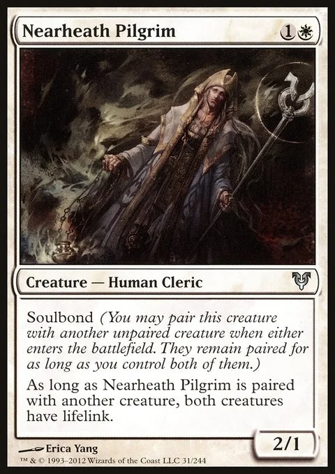 Soulbond (You may pair this creature with another unpaired creature when either enters the battlefield. They remain paired for as long as you control both of them.) As long as Nearheath Pilgrim is paired with another creature, both creatures have lifelink.