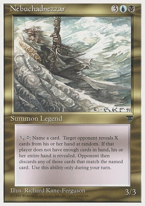 X, T: Name a card. Target opponent reveals X cards from his or her hand at random. If that player does not have enough cards in hand, his or her entire hand is revealed. Opponent then discards any of those cards that match the named card. Use this ability only during your turn.