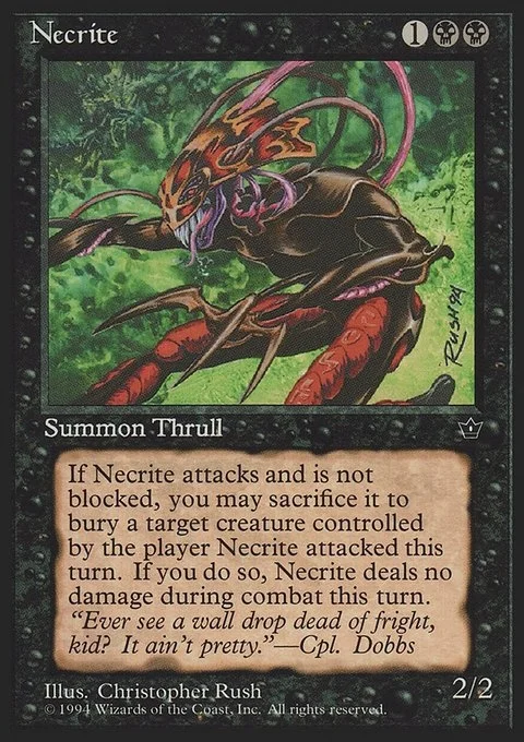 Whenever Necrite attacks and isn't blocked, you may sacrifice it. If you do, destroy target creature defending player controls. It can't be regenerated.