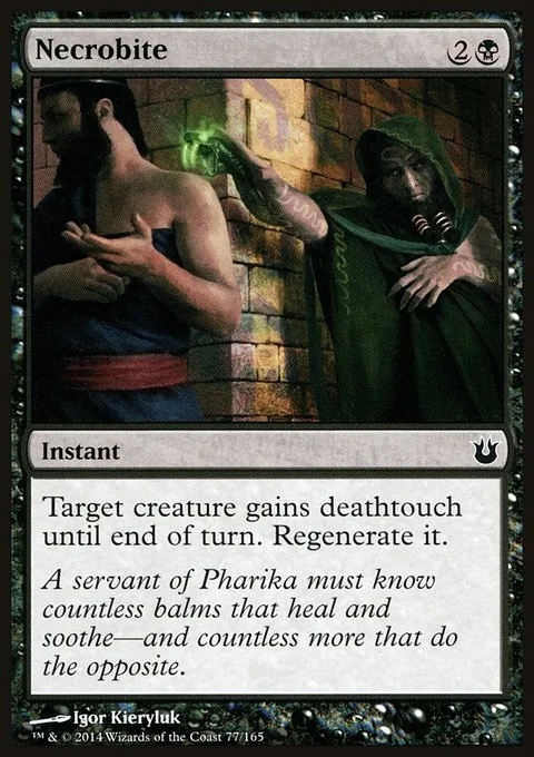 Target creature gains deathtouch until end of turn. Regenerate it. (The next time that creature would be destroyed this turn, it isn't. Instead tap it, remove all damage from it, and remove it from combat. Any amount of damage a creature with deathtouch deals to a creature is enough to destroy it.)