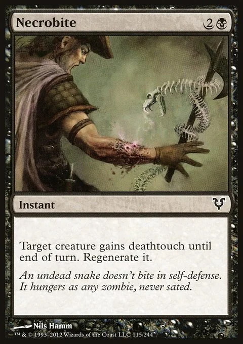 Target creature gains deathtouch until end of turn. Regenerate it. (The next time that creature would be destroyed this turn, it isn't. Instead tap it, remove all damage from it, and remove it from combat. Any amount of damage a creature with deathtouch deals to a creature is enough to destroy it.)
