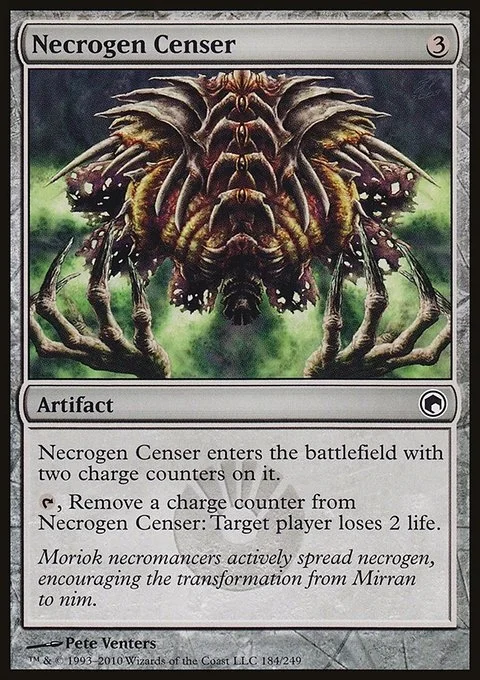 Necrogen Censer enters the battlefield with two charge counters on it. {T}, Remove a charge counter from Necrogen Censer: Target player loses 2 life.