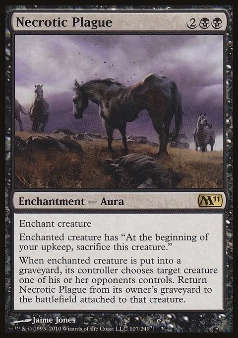 When enchanted creature dies, its controller chooses target creature one of their opponents controls. Return Necrotic Plague from its owner's graveyard to the battlefield attached to that creature.
