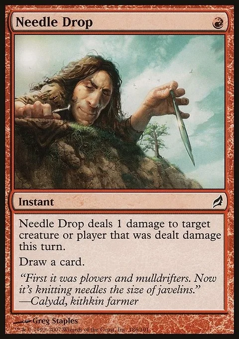 Needle Drop deals 1 damage to any target that was dealt damage this turn. Draw a card.