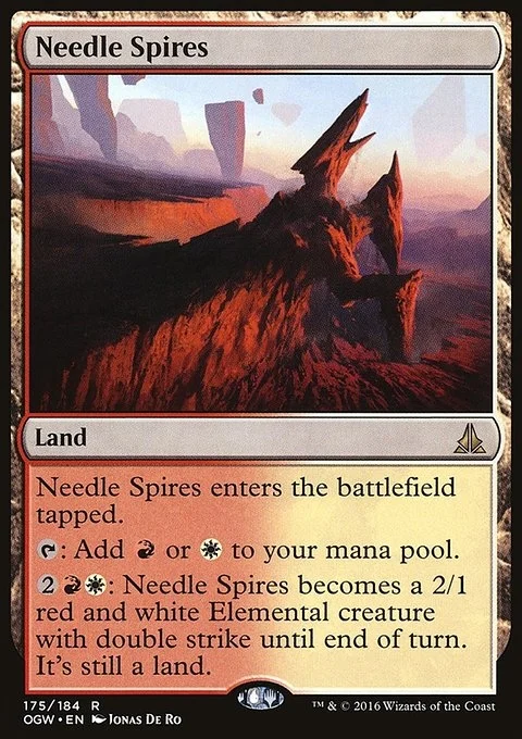 Needle Spires enters the battlefield tapped. {T}: Add {R} or {W}. {2}{R}{W}: Needle Spires becomes a 2/1 red and white Elemental creature with double strike until end of turn. It's still a land.
