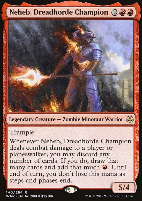 Trample Whenever Neheb, Dreadhorde Champion deals combat damage to a player or planeswalker, you may discard any number of cards. If you do, draw that many cards and add that much {R}. Until end of turn, you don't lose this mana as steps and phases end.