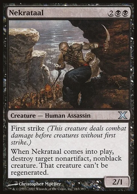 First strike When Nekrataal enters the battlefield, destroy target nonartifact, nonblack creature. That creature can't be regenerated.