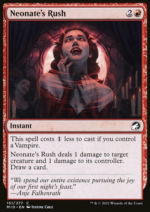 This spell costs {1} less to cast if you control a Vampire. Neonate's Rush deals 1 damage to target creature and 1 damage to its controller. Draw a card.