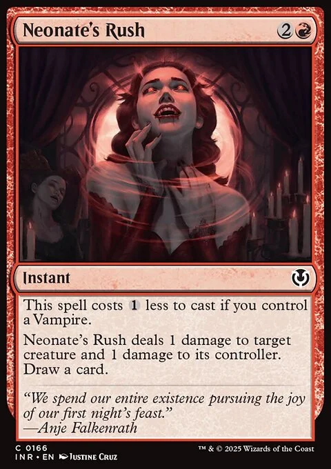 This spell costs {1} less to cast if you control a Vampire. Neonate's Rush deals 1 damage to target creature and 1 damage to its controller. Draw a card.