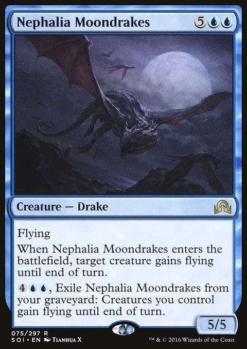 Flying When Nephalia Moondrakes enters the battlefield, target creature gains flying until end of turn. {4}{U}{U}, Exile Nephalia Moondrakes from your graveyard: Creatures you control gain flying until end of turn.
