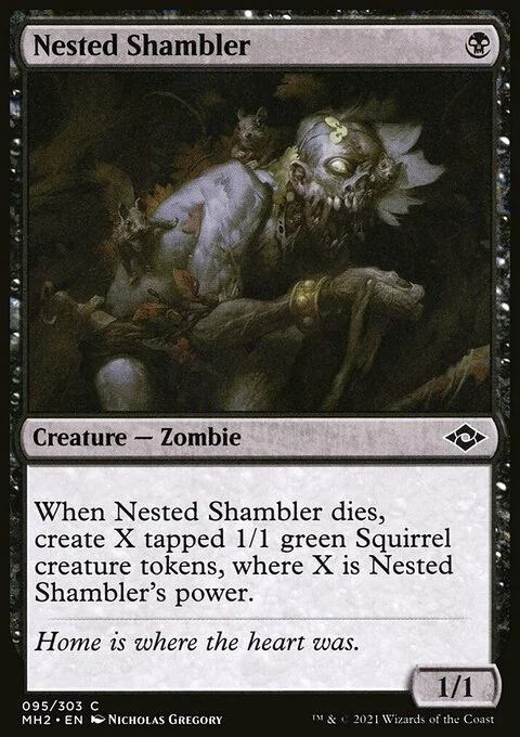 When Nested Shambler dies, create X tapped 1/1 green Squirrel creature tokens, where X is Nested Shambler's power.