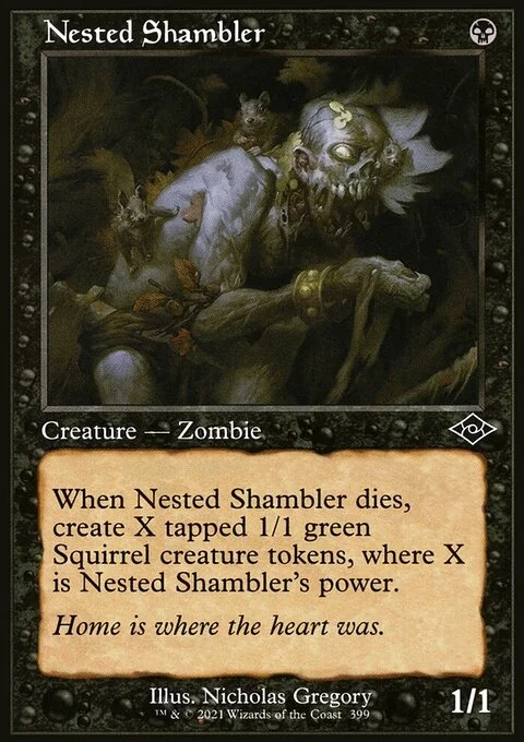 When Nested Shambler dies, create X tapped 1/1 green Squirrel creature tokens, where X is Nested Shambler's power.