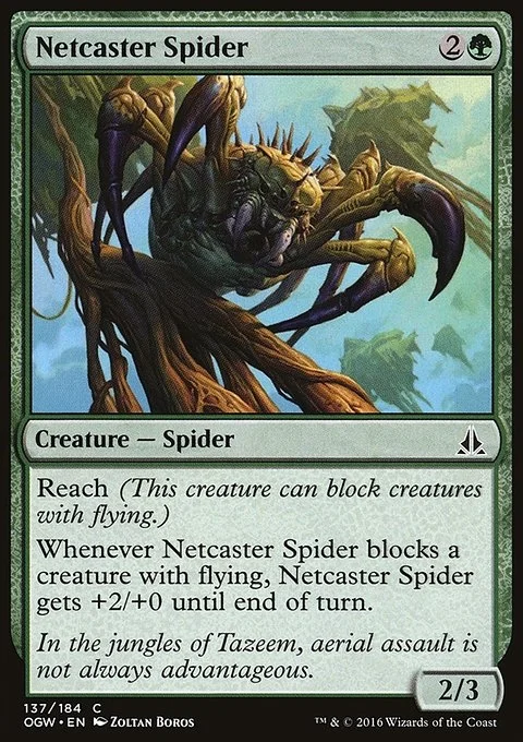 Reach (This creature can block creatures with flying.) Whenever Netcaster Spider blocks a creature with flying, Netcaster Spider gets +2/+0 until end of turn.