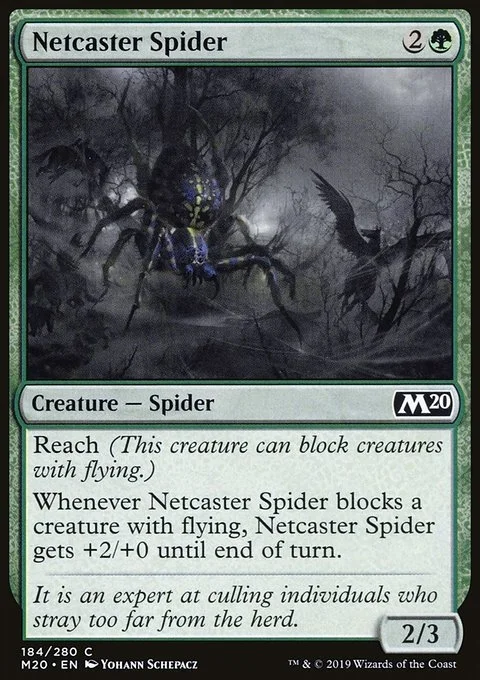 Reach (This creature can block creatures with flying.) Whenever Netcaster Spider blocks a creature with flying, Netcaster Spider gets +2/+0 until end of turn.