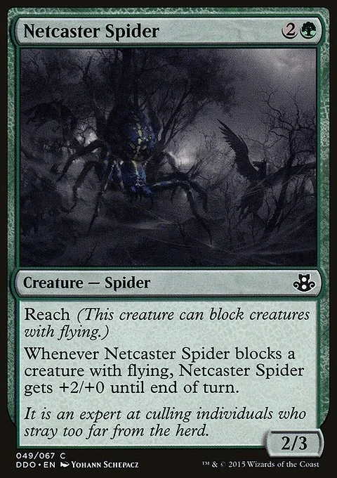 Reach (This creature can block creatures with flying.) Whenever this creature blocks a creature with flying, this creature gets +2/+0 until end of turn.