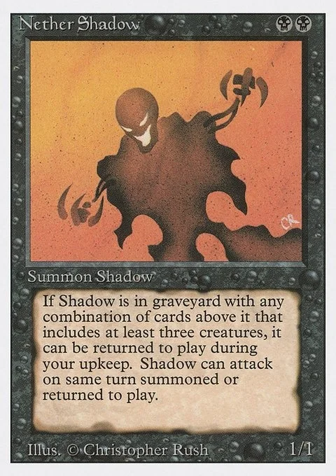 If Shadow is in graveyard with any combination of cards above it that includes at least three creatures, it can be returned to play during your upkeep. Shadow can attack on same turn summoned or returned to play.