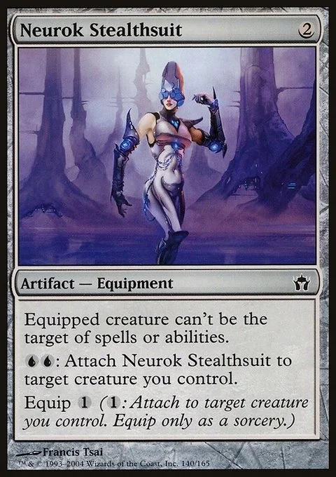 Equipped creature has shroud. (It can't be the target of spells or abilities.) {U}{U}: Attach Neurok Stealthsuit to target creature you control. Equip {1} ({1}: Attach to target creature you control. Equip only as a sorcery.)