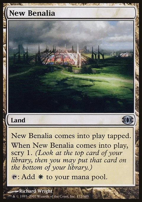 New Benalia enters the battlefield tapped. When New Benalia enters the battlefield, scry 1. (Look at the top card of your library. You may put that card on the bottom of your library.) {T}: Add {W}.