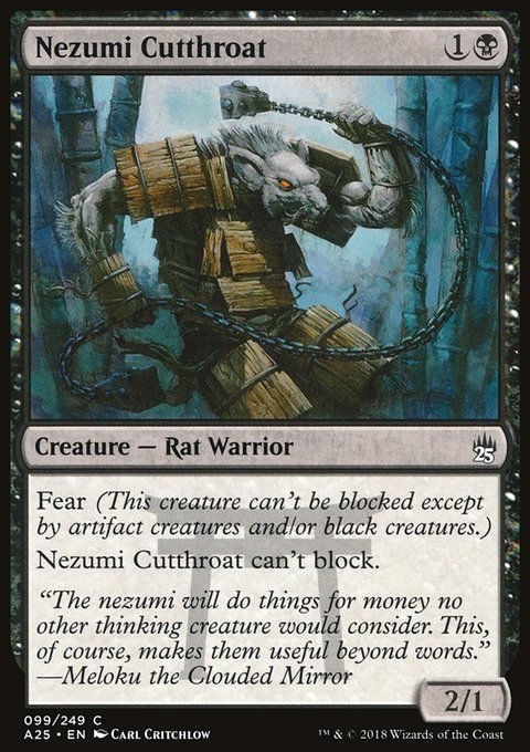 Fear (This creature can't be blocked except by artifact creatures and/or black creatures.) Nezumi Cutthroat can't block.