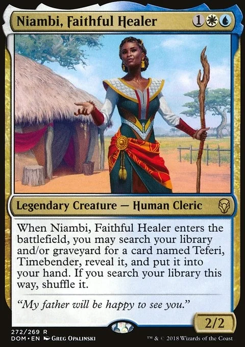 When Niambi, Faithful Healer enters the battlefield, you may search your library and/or graveyard for a card named Teferi, Timebender, reveal it, and put it into your hand. If you search your library this way, shuffle.