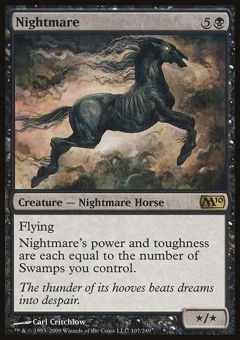 Flying (This creature can't be blocked except by creatures with flying or reach.) Nightmare's power and toughness are each equal to the number of Swamps you control.