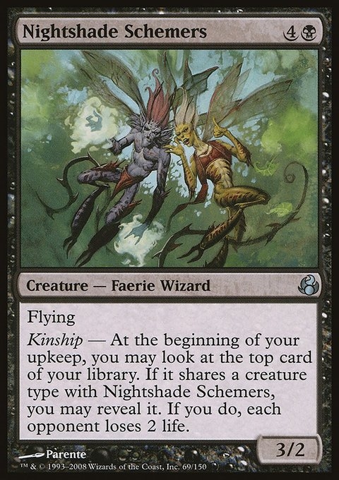 Kinship — At the beginning of your upkeep, you may look at the top card of your library. If it shares a creature type with Nightshade Schemers, you may reveal it. If you do, each opponent loses 2 life.