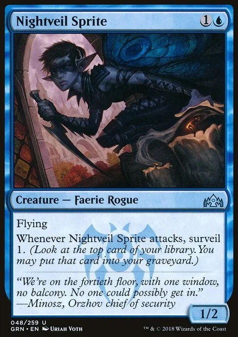 Flying Whenever Nightveil Sprite attacks, surveil 1. (Look at the top card of your library. You may put that card into your graveyard.)
