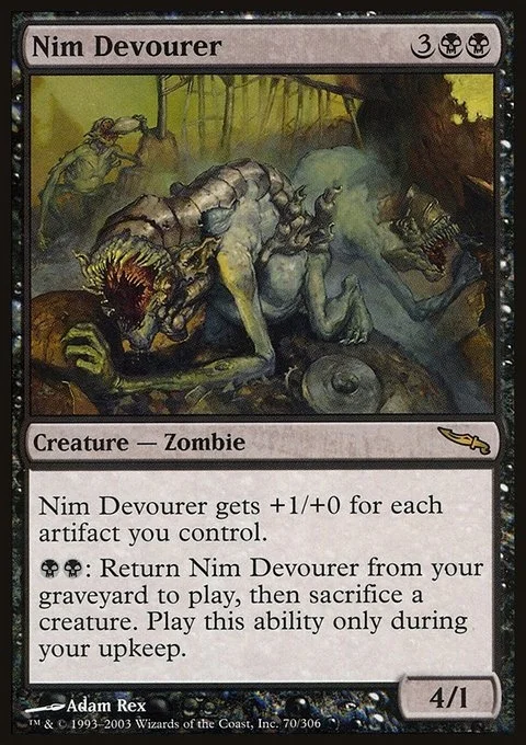 Nim Devourer gets +1/+0 for each artifact you control. {B}{B}: Return Nim Devourer from your graveyard to the battlefield, then sacrifice a creature. Activate only during your upkeep.