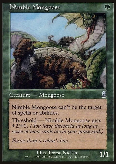 Shroud (This creature can't be the target of spells or abilities.) Threshold — Nimble Mongoose gets +2/+2 as long as seven or more cards are in your graveyard.