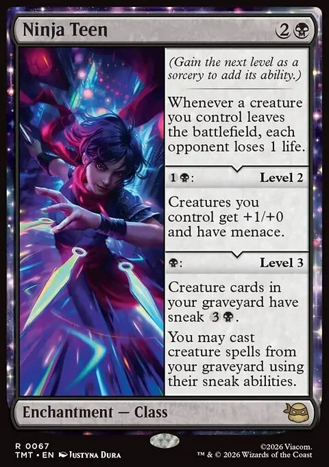(Gain the next level as a sorcery to add its ability.) Whenever a creature you control leaves the battlefield, each opponent loses 1 life. {1}{B}: Level 2 Creatures you control get +1/+0 and have menace. {B}: Level 3 Creature cards in your graveyard have sneak {3}{B}. You may cast creature spells from your graveyard using their sneak abilities.