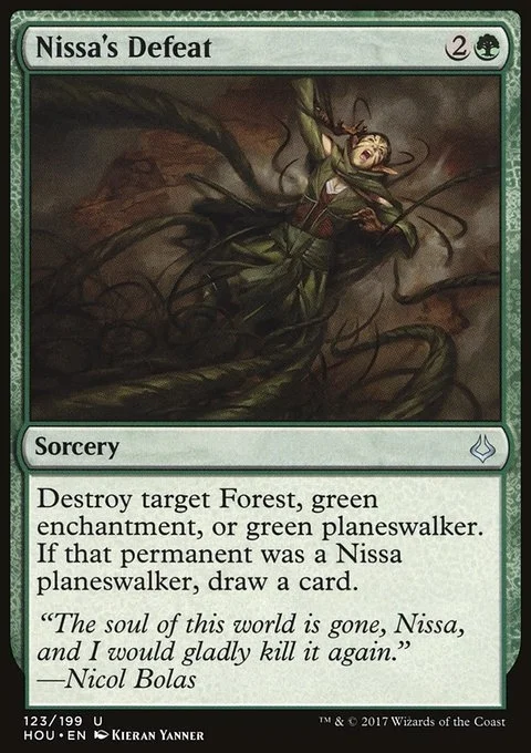 Destroy target Forest, green enchantment, or green planeswalker. If that permanent was a Nissa planeswalker, draw a card.
