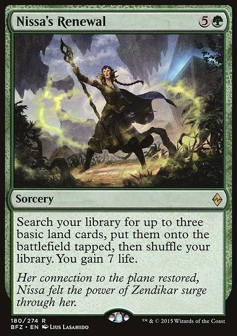 Search your library for up to three basic land cards, put them onto the battlefield tapped, then shuffle your library. You gain 7 life.