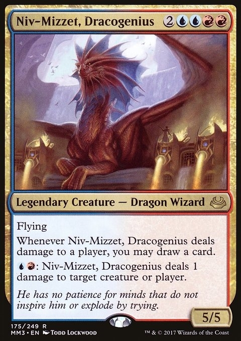 Flying Whenever Niv-Mizzet, Dracogenius deals damage to a player, you may draw a card. {U}{R}: Niv-Mizzet, Dracogenius deals 1 damage to any target.