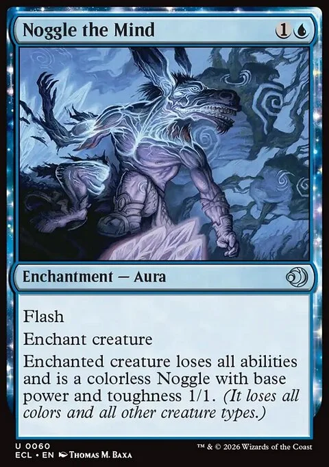 Flash Enchant creature Enchanted creature loses all abilities and is a colorless Noggle with base power and toughness 1/1. (It loses all colors and all other creature types.)