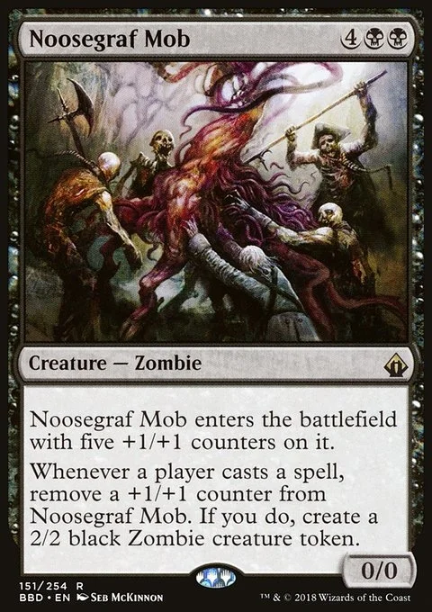 Noosegraf Mob enters the battlefield with five +1/+1 counters on it. Whenever a player casts a spell, remove a +1/+1 counter from Noosegraf Mob. If you do, create a 2/2 black Zombie creature token.