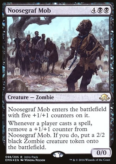 Noosegraf Mob enters with five +1/+1 counters on it. Whenever a player casts a spell, remove a +1/+1 counter from Noosegraf Mob. If you do, create a 2/2 black Zombie creature token.