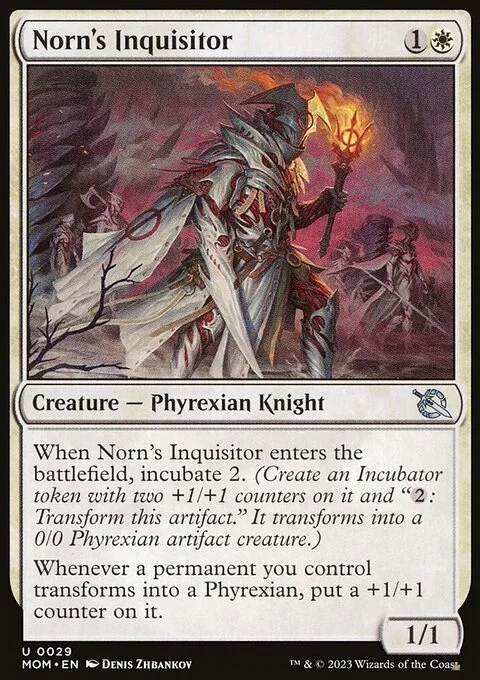 When Norn's Inquisitor enters the battlefield, incubate 2. (Create an Incubator token with two +1/+1 counters on it and "{2}: Transform this artifact." It transforms into a 0/0 Phyrexian artifact creature.)