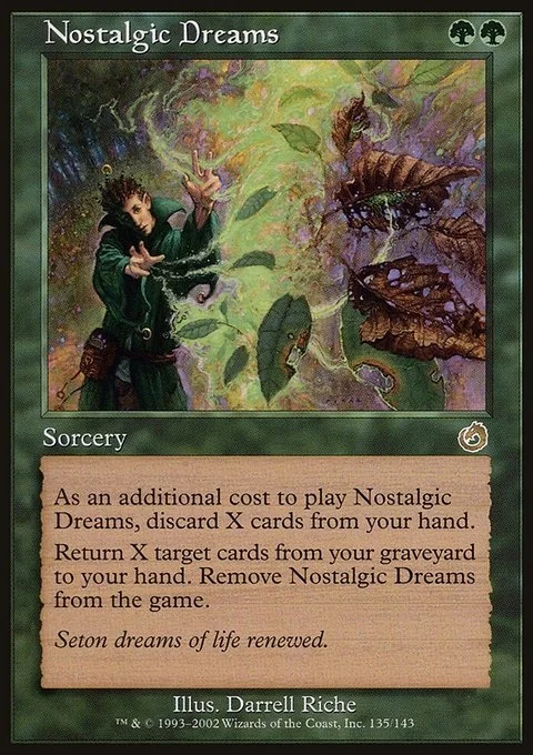 As an additional cost to cast this spell, discard X cards. Return X target cards from your graveyard to your hand. Exile Nostalgic Dreams.