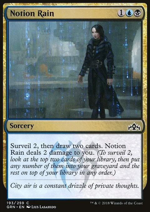 Surveil 2, then draw two cards. Notion Rain deals 2 damage to you. (To surveil 2, look at the top two cards of your library, then put any number of them into your graveyard and the rest on top of your library in any order.)