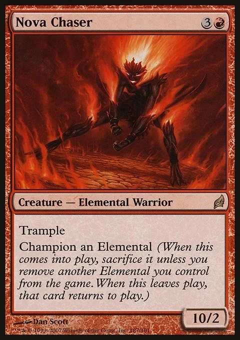 Trample Champion an Elemental (When this enters the battlefield, sacrifice it unless you exile another Elemental you control. When this leaves the battlefield, that card returns to the battlefield.)