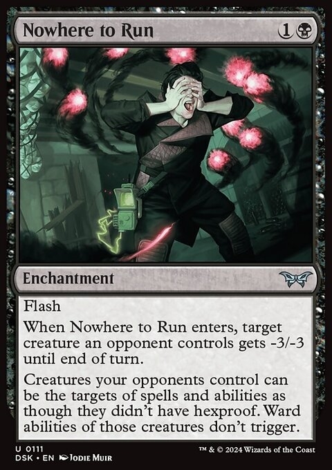 Flash When Nowhere to Run enters, target creature an opponent controls gets -3/-3 until end of turn. Creatures your opponents control can be the targets of spells and abilities as though they didn't have hexproof. Ward abilities of those creatures don't trigger.